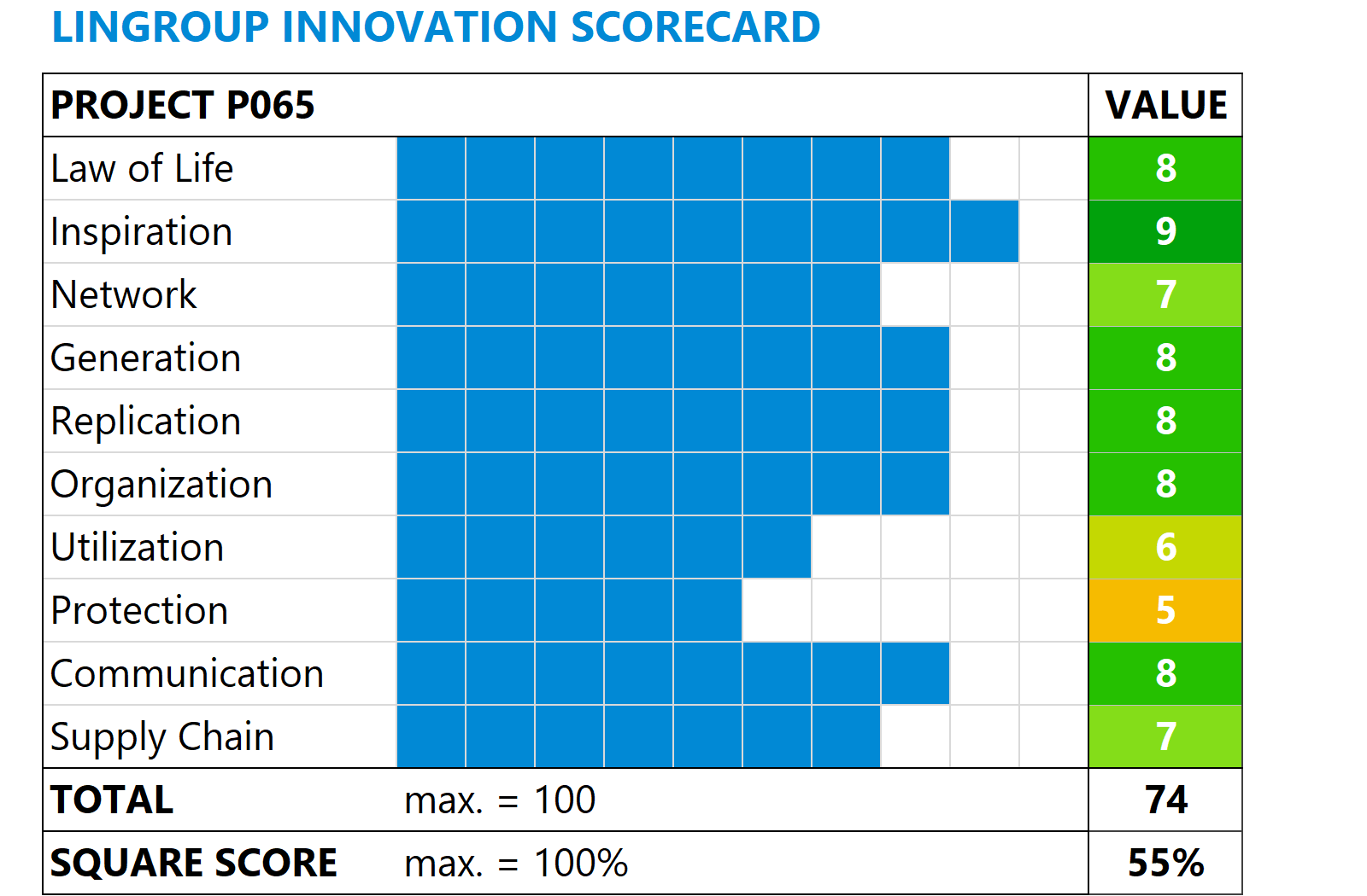 Das Erfolgsprojekt P065 hat hingegen mit 74 Punkten gute 55% Innovationspotenzial.